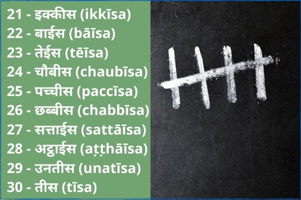 यहाँ 21 से 30 तक के हिंदी अंक और उनके नाम दिए गए हैं: