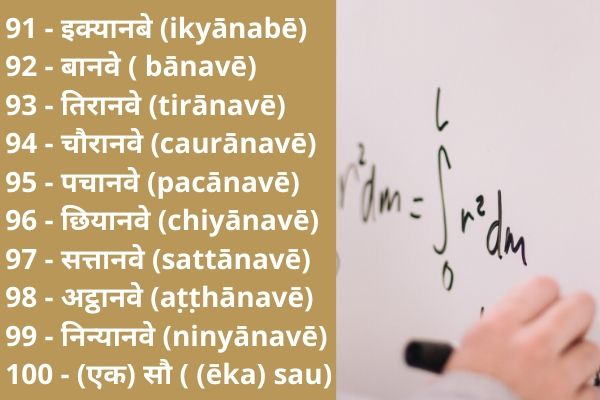 यहाँ 91 से 100 तक के हिंदी अंक और उनके नाम दिए गए हैं: